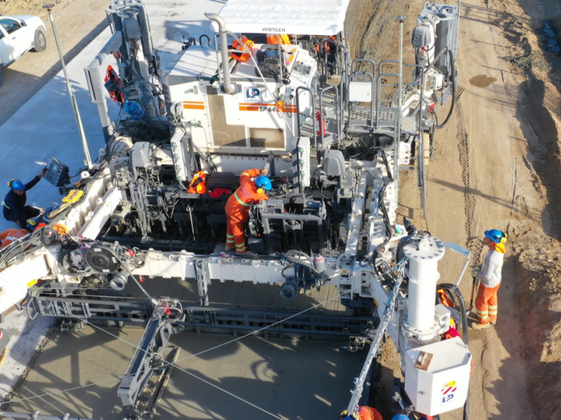 Construcción de calzada de hormigón con terminadoras autopropulsadas.